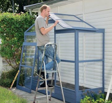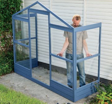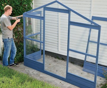 Lyft in växthuset mot väggen när du har satt ihop de tre stora ramarna. Placera växthuset där det ska stå.