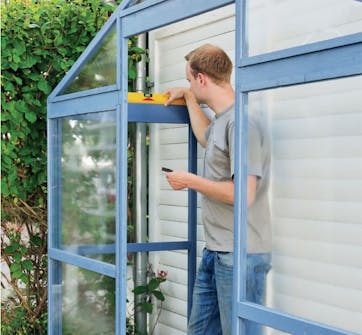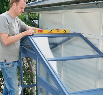 Justera växthuset så att det står vågrätt både längs framsidan och längs sidorna. Sätt små kilar eller masonitbitar under tills det står vågrätt.