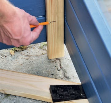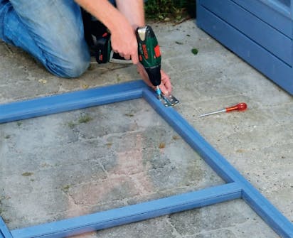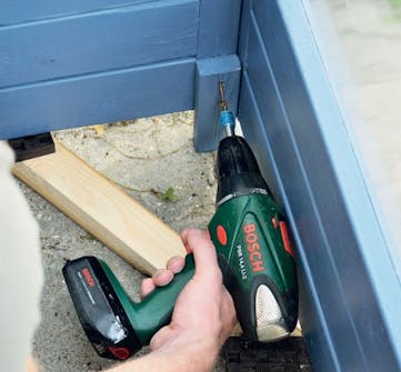 Täck springan mellan marken och de tre sidorna med tre 22 x 95 mm brädor, som skruvas fast invändigt med 4 x 35 mm skruvar. Brädorna är utsatta för fukt, men de kan ju bytas efter ett par år.