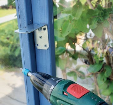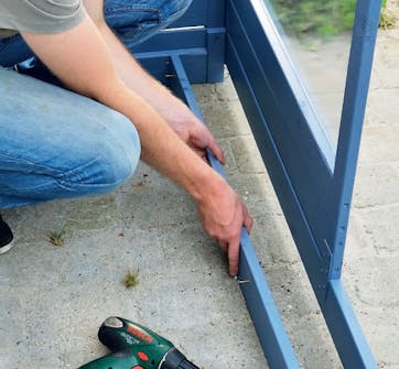 Skruva fast det målade stödbenet på sidoramen med 4 x 35 mm skruvar. Skjut in stödbenet längst in i hörnet så att det står stadigt och inte ger med sig. Förskjut skruvarna en bit.