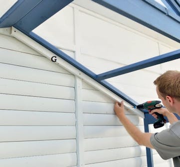 Om fasaden inte är helt plan kan det vara nödvändigt att montera en extra täcklist mellan väggen och sidan. Här är det en list nertill på väggen som tvingar ut växthuset en bit.