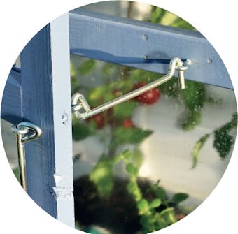 Det är klokt att sätta en eller ett par stormkrokar på dörren, för då kan den stå öppen i olika lägen och sänka temperaturen i växthuset.