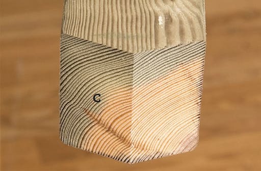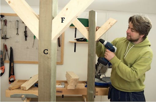 De fyra delarna E i de två takstolarna sågas av snett i ena änden. Biten som sågas bort skruvas fast på den andra sidan för att taket ska plana ut. Förborra innan du skruvar.