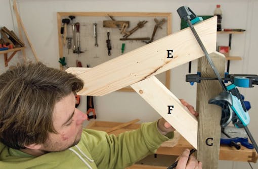 Delarna E spänns med tvingar upptill på stolpen. Därefter kan du markera för de snedställda stöttorna F innan de sågas till. De ska sluta tätt både mot stolpe och takstol.