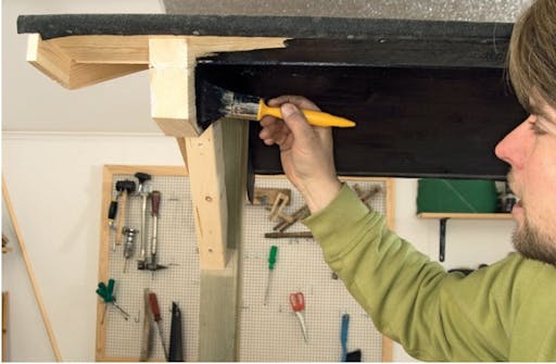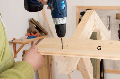 I den nedre av takbrädorna G ska du förborra med 4 mm borr, eftersom det annars är risk att du spräcker den lilla stumpen som har limmats fast. Därefter fästs brädorna med 4,2 x 45 mm skruvar.