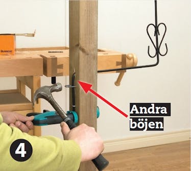 Bägge bockningarna gjordes i 90 grader. Den första gjordes precis under utsmyckningen, och den andra så att hållaren hamnar minst 30 cm från stolpen.