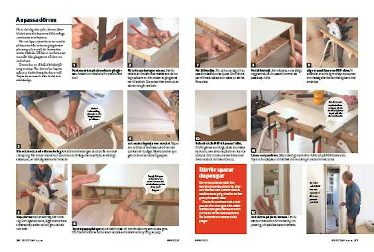 Under alla omständigheter ska delarna passa ihop, så börja med att anpassa karmen till ditt dörrhål: Mät höjd och bredd, markera samma mått på karmdelarna, minus en centimeter åt varje håll för fog, och såga.