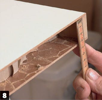 Tryck in pappfyllningen så att det blir plats för den förstärkning som du ska göra. Dörrbladet består av tunna skivor utanpå en bikakeliknande fyllning av papp.
