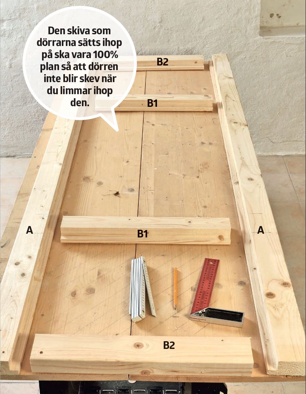 Så här ska det se ut när tvärslåarna (B1) har sågats till. Hacket passar exakt in i falsen på sidorna (A). Var noggrann med passningen – delarna ska passa ihop exakt för att ge dörren stabilitet.