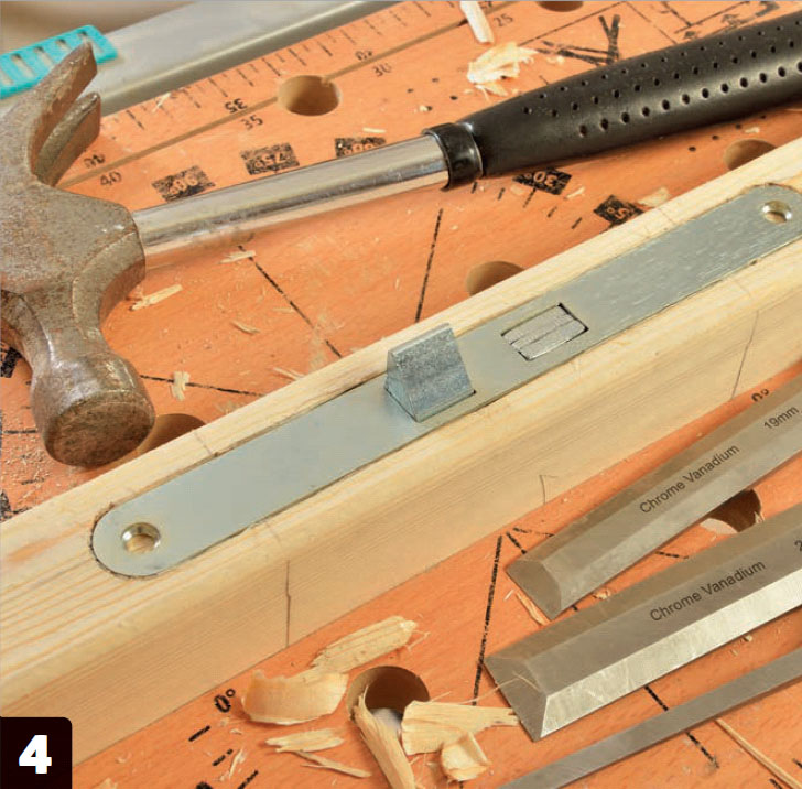 Börja med hålet till låskistan. Rita upp låskistan på den ena ramsidan (A). Borra sedan en rad hål lika djupa som låskistan är och använd ett stämjärn för att ta bort resten av träet i hålet.