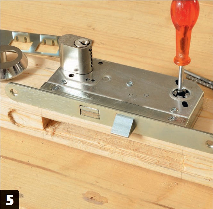 Lägg i låskistan igen och kolla att frontplattan fluktar exakt med ramsidan. Den får inte ligga för djupt, då får låset inte tag i karmen, och inte för högt, då tar låset i när dörren stängs.