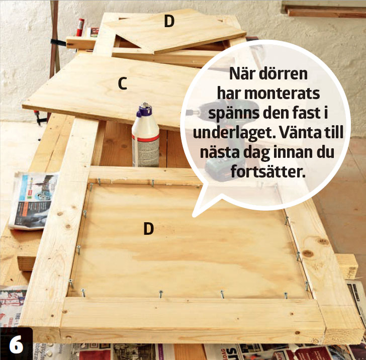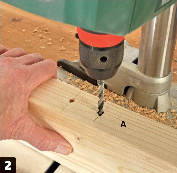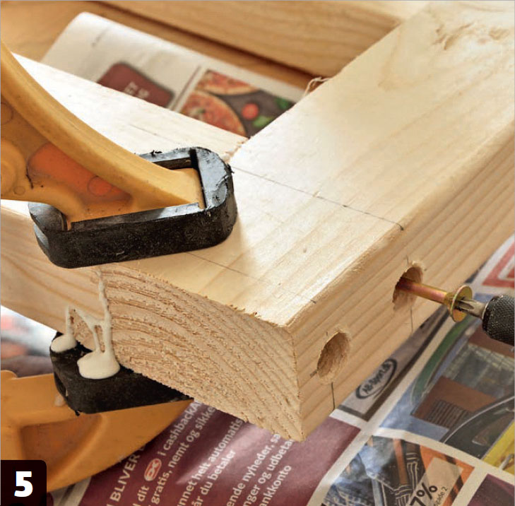 Förborra för alla skruvarna. Ramen ska sättas ihop med 6 x 200 mm skruv, så förborra mitt i sidoramen (A) med ett långt 6 mm-träborr. Har du inte ett borrstativ går det även med en skruvdragare.