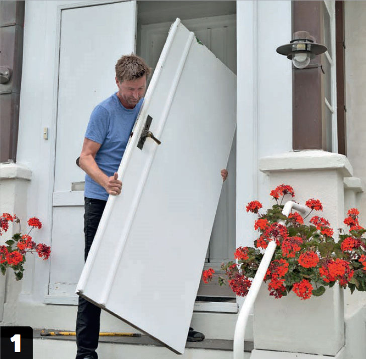 Börja med att ta bort de gamla dörrarna. Om de gamla gångjärnen (och karmarna) är okej, låt dem sitta kvar. Här är det för övrigt bra med ett extra par händer. Ytterdörrar är tyngre än vad de ser ut.