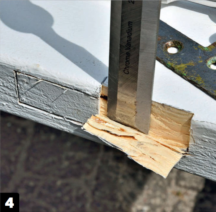 Stäm ut efter markeringarna. Här är det viktigt att vara väldigt försiktig, så att du bara tar bort det nödvändigaste. Se till att underlaget är plant och tryck stämjärnet genom träet utan att använda en hammare.