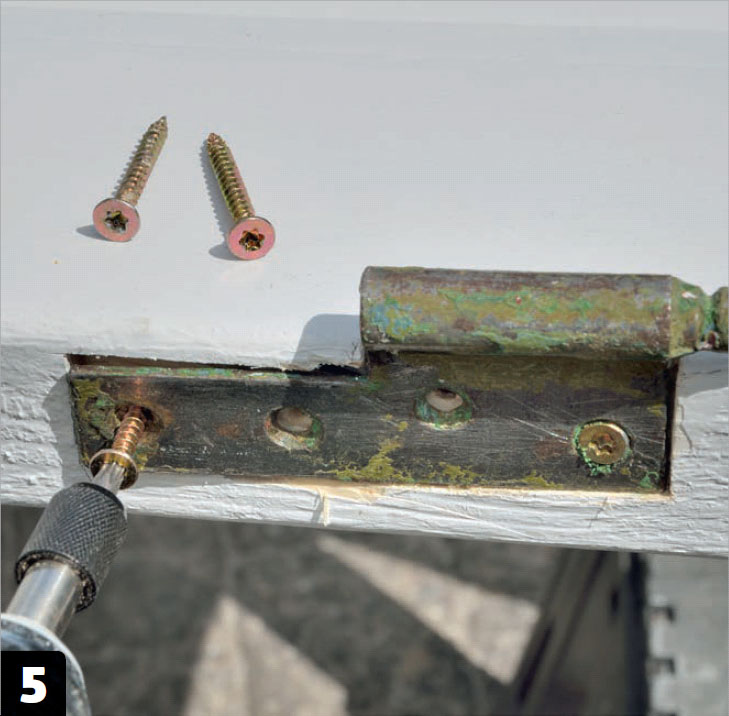 Förborra till skruvar och skruva fast gångjärnen. Precis som med låskistan och låsblecket ska gångjärnens platta flukta med dörramen. Limma inte fast gångjärnen men lägg gärna en klick linoljekitt under.