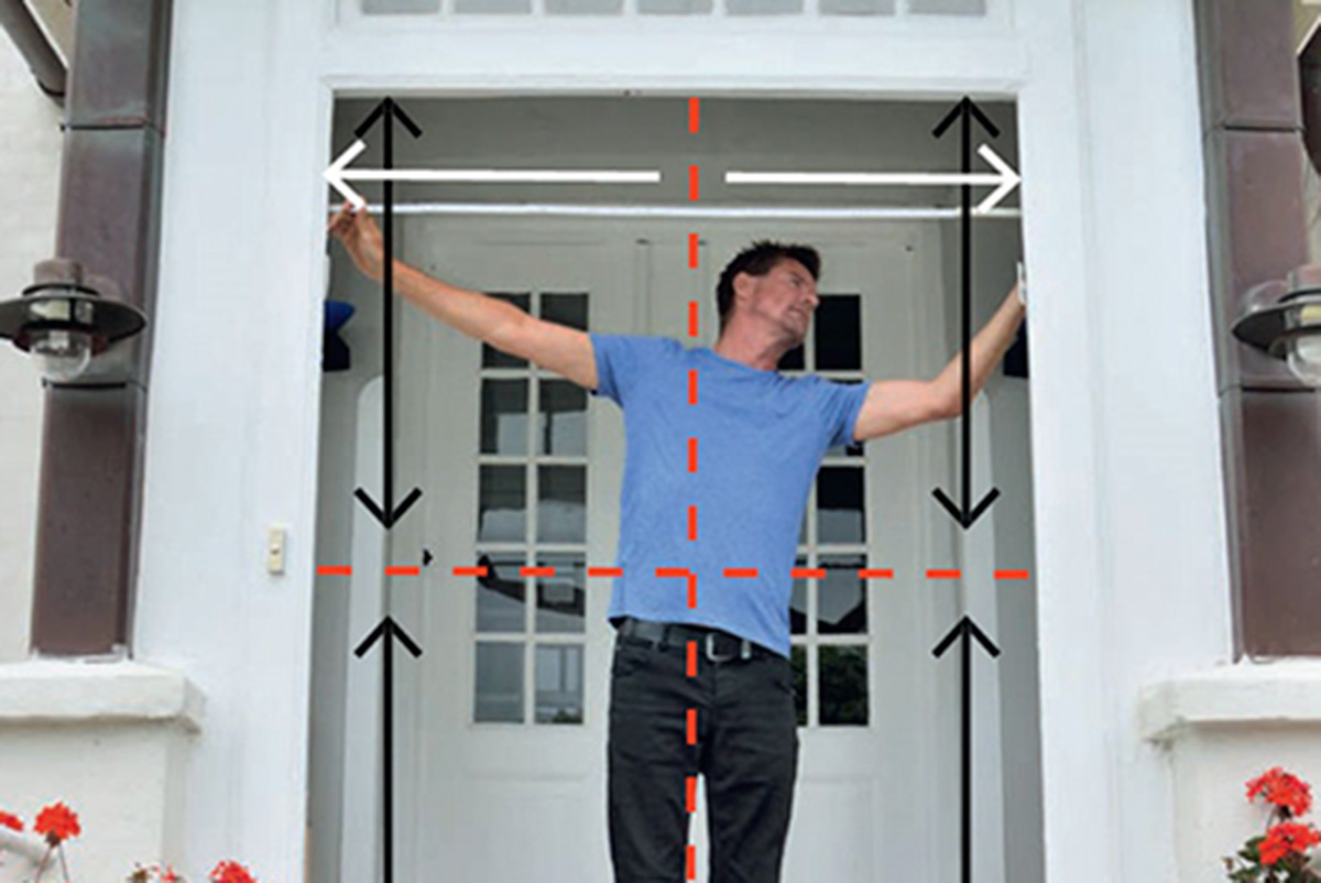 Var noggrann när du mäter. Börja med att markera mitten på ovan-, under- och långsidorna med ett vattenpass (röda streck). Sedan mäter du utifrån markeringarna på alla sidor och för över måtten till en ritning.