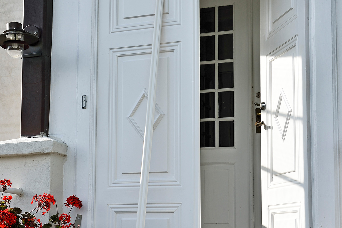I gamla hus som det här kan man inte utgå ifrån att allt är rakt och vinkelrätt. Därför har vi valt att göra dörrarna så att de passar exakt i dörrhålet – medvetna om att vi kan kan behöva såga av lite runt omkring.