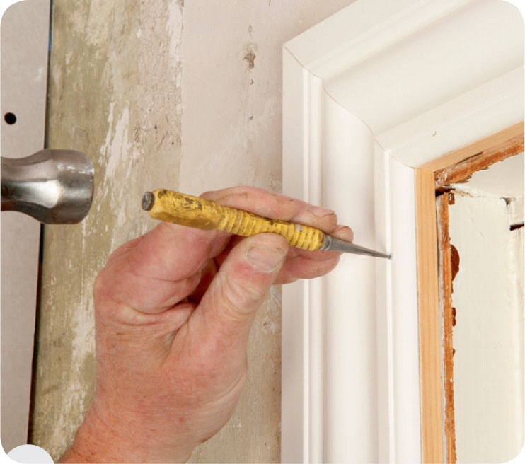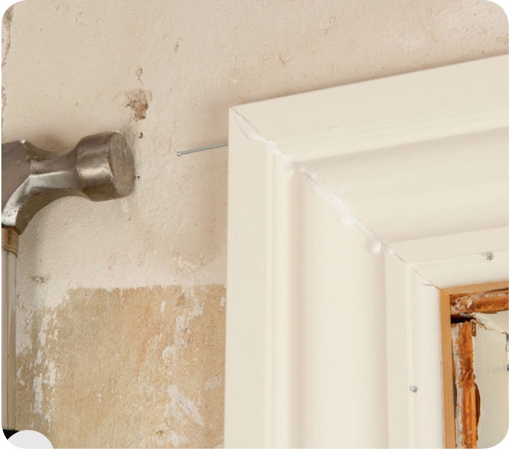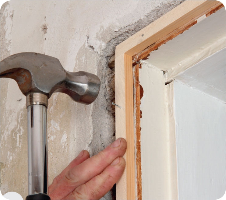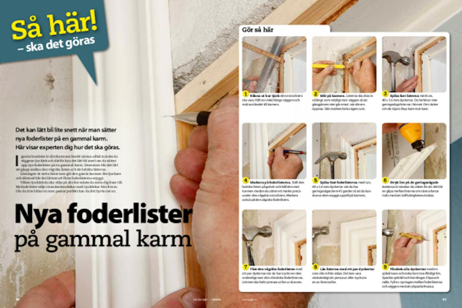 Spika fast foderlisterna med t.ex. 40 x 1,6 mm dyckertar när du har geringssågat dem 45 grader så att du kan skarva dem snyggt upptill på karmen.