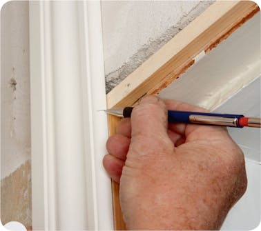 Markera på foderlisterna. Ställ den lodräta listen på golvet och håll den mot karmen medan du sätter ett märke precis under den vågräta extra listen. Markera också på den vågräta foderlisten.