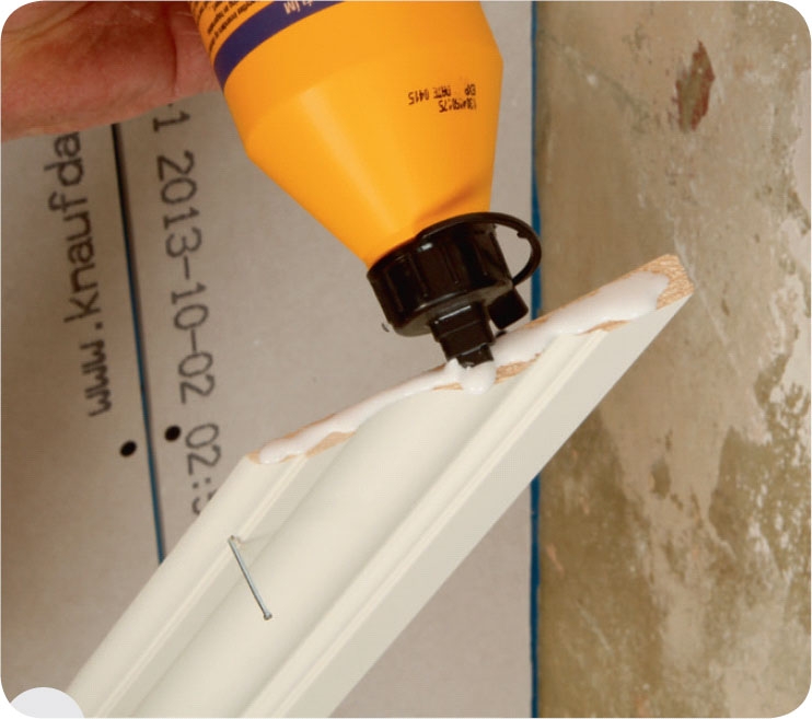 Spika fast listerna med t.ex. 40 x 1,6 mm dyckertar. Du behöver inte geringssåga listerna i hörnet. Det räcker om de skjuts ihop kant mot kant.