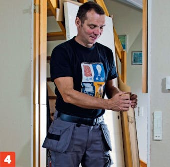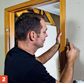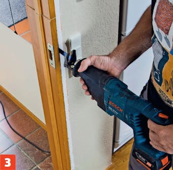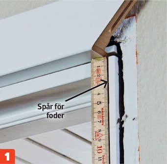 Den gamla karmen tas bort. Är den fastspikad är det en bra idé att kapa spikarna med en tigersåg. Då slipper du skada väggen när karmen avlägsnas.