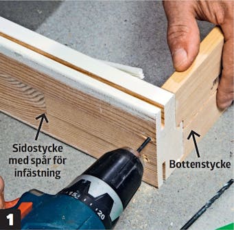 Trekantslist monteras med dyckert. Då både list och bottenstycke är av hårdträ, förborrar vi med ett 1 mm borr. Kom ihåg att först lägga en kloss mitt under bottenstycket, så att det inte sjunker.