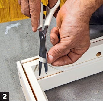De medföljande tätningslisterna klipps till med en sax. Listerna får dörren att bli mer tät och gör att den stängs tystare.