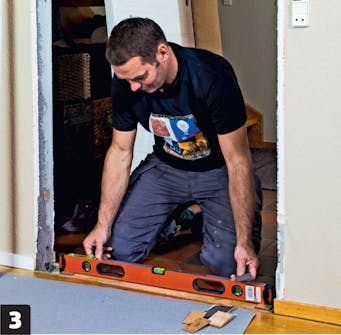 Det klossas upp för bottenstycket, innan dörren sätts i. Låt ev. uppklossningen vara 0,5-1 mm högre i gångjärnssidan, då karmen ibland sätter sig litegrann.