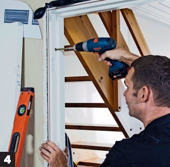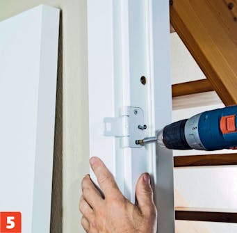 Karmen skruvas fast med de tillhörande karmskruvarna i gångjärnssidan. Kontrollera att karmen är lodrät.