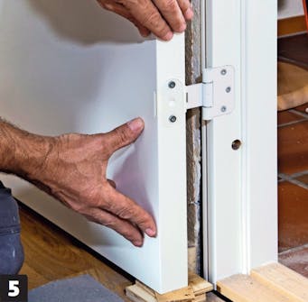 Dörren hängs på temporärt. Är dörren tung och svår att få på, kan du lägga några klossar under som stöd.