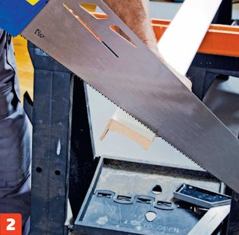 Fodrets sidostycken sågas till. De ska bara sågas till i botten, då de redan är kapade i vinkel (45°) i toppen.