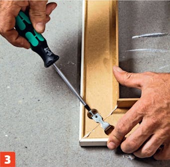 Dörrkarmen fogas samman och bottenstycket skruvas fast i förborrade hål, så att det hårda träet inte spricker.