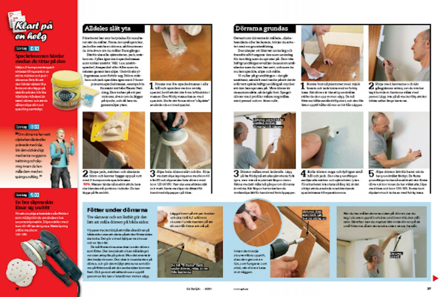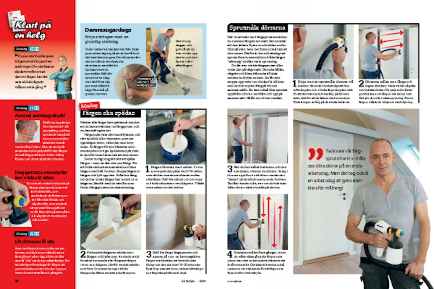 Under natten har slipdammet från lördagens arbete lagt sig, så att du kan få bort det med dammsugare. Om dörrarna står i det rum där du har slipat, ska de torkas av med lätt fuktig trasa innan du sprutmålar. Ställ dörrarna mot en vägg men täck först väggen med målarf lt. Lägg filt också på golvet i rummet.