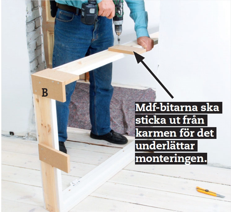 Fäst bitar av mdf (B) hela vägen runt karmen. Såga till 11 bitar av 19 mm mdf-skiva och fäst från utsidan på karmen med 5 x 50 mm skruvar. Då kan du fästa karmen i öppningen utan att skruva i den invändiga delen av karmen.