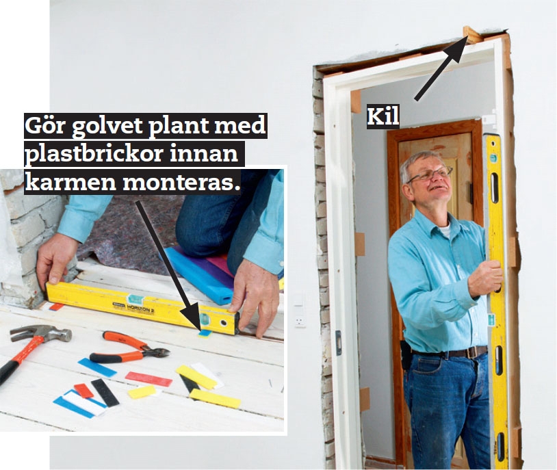 Ställ karmen i dörröppningen. Fäst en kil längst upp på gångjärnssidan så att karmen blir stående. Justera med plastbrickor tills karmen står lodrätt och vågrätt.