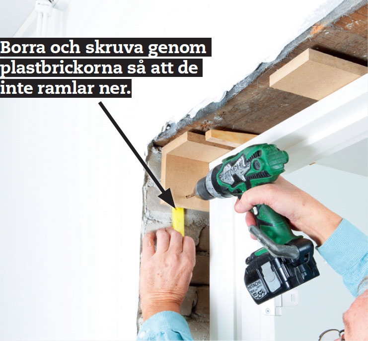 Fäst karmen på gångjärnsidan med två skruvar upptill och två nertill. Borra först 6 mm hål i mdf-bitarna (inte mitt för en tegelfog!) och sedan 6 mm hål i väggen. Fäst med 7 mm betongskruvar i tegel eller med träskruvar i träreglar.