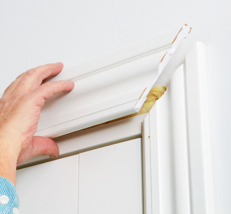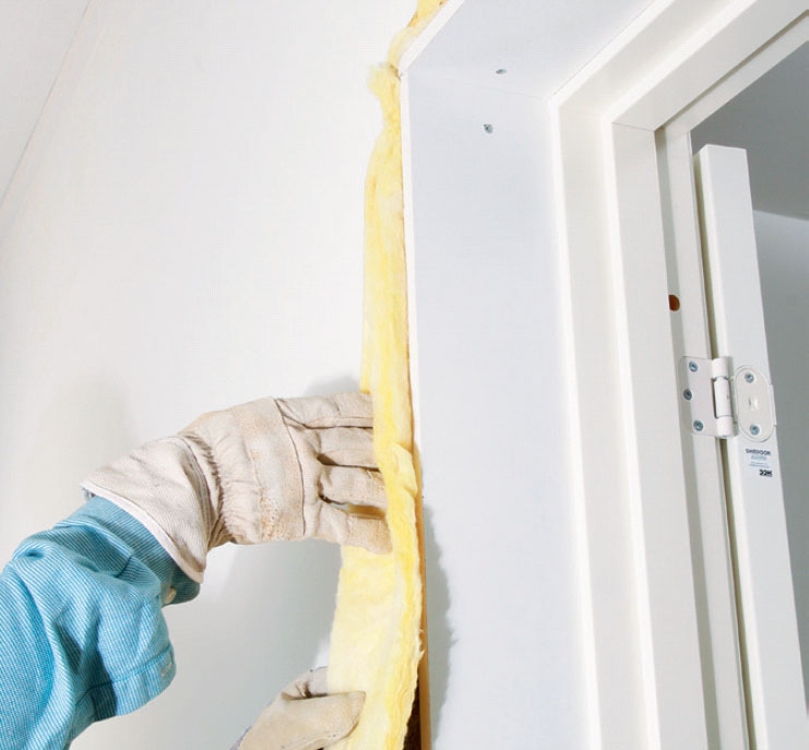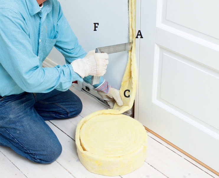 Isolera mellan karmen (A) och väggen (F) med drevremsor eller annan isolering (C), så minskas ljudgenomgången (och draget) mellan rummen.