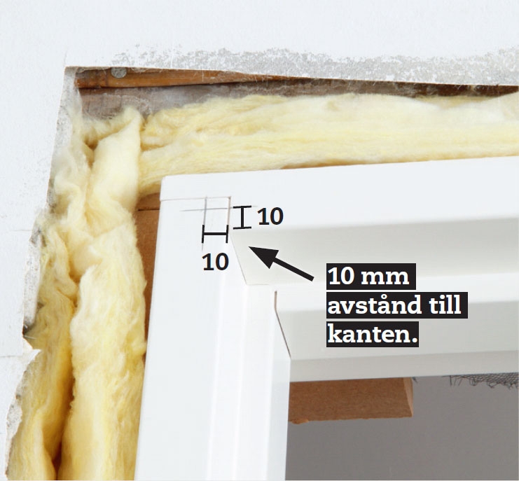 Markera på karmen för foderlisterna. Sätt ett par blyertsstreck i varje övre hörn och några längs sidorna. Här har vi satt märken 10 mm från kanten för att foderlisten ska kunna täcka springan mellan karm och vägg.