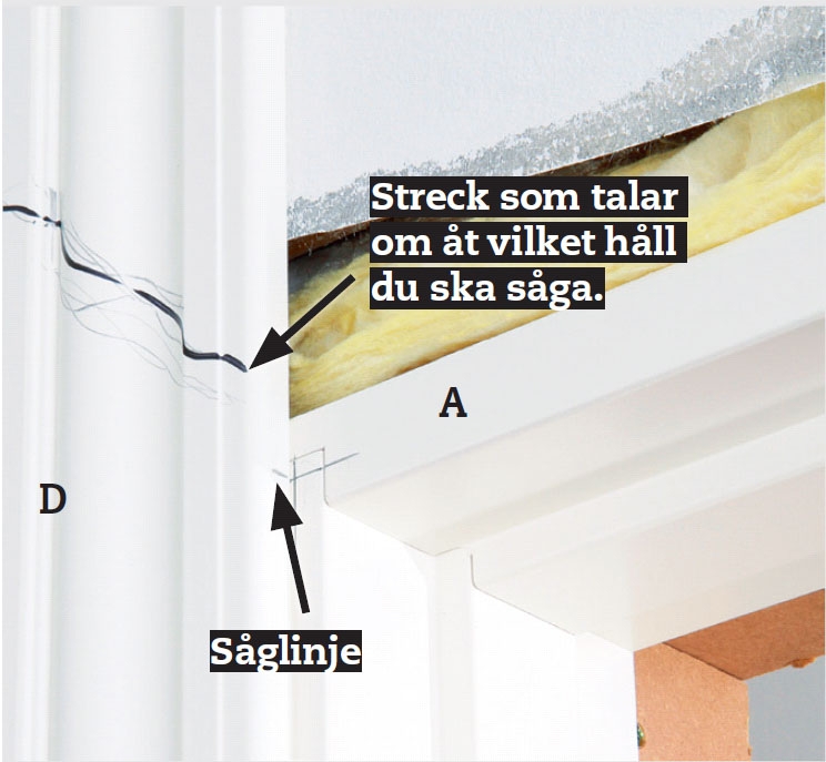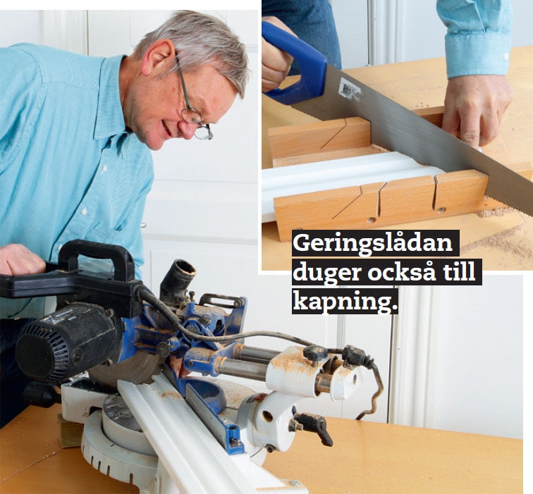 Såga av foderlisten i 45 grader. Har du en kap- och geringssåg går det lätt, men kom ihåg att vända listen åt rätt håll. Har du ingen kap- och geringssåg så går det bra att använda geringslåda och fintandad fanersåg.
