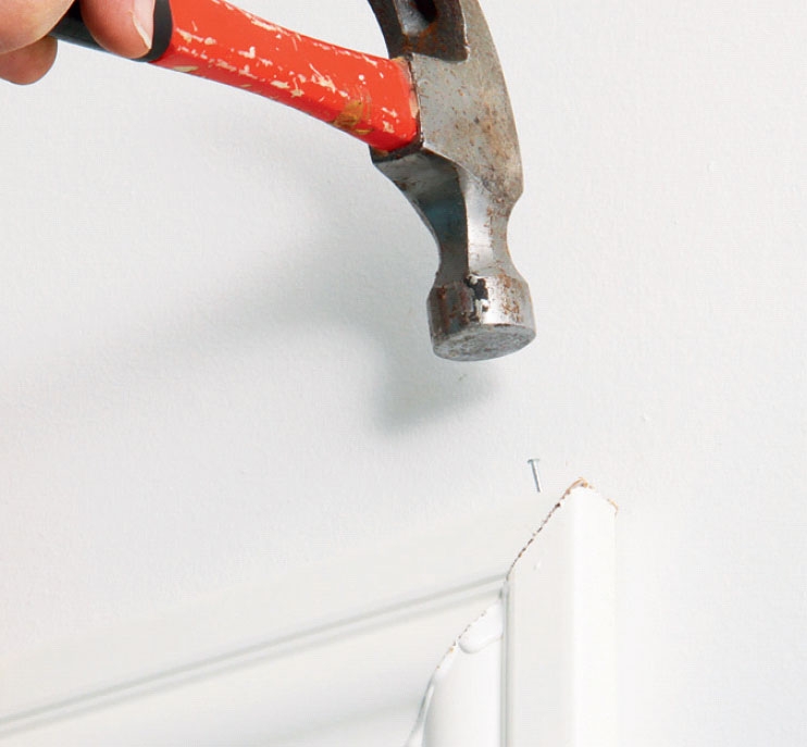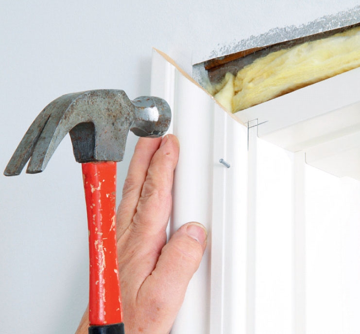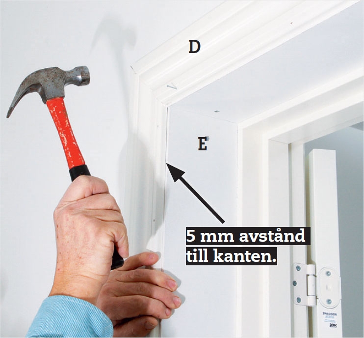 Spika fast foderlisten på karmen med 40 x 1,6 mm dyckert och försänk alla spikhuvuden. Spackla över med fin snickarspackel så syns inte spikarna.