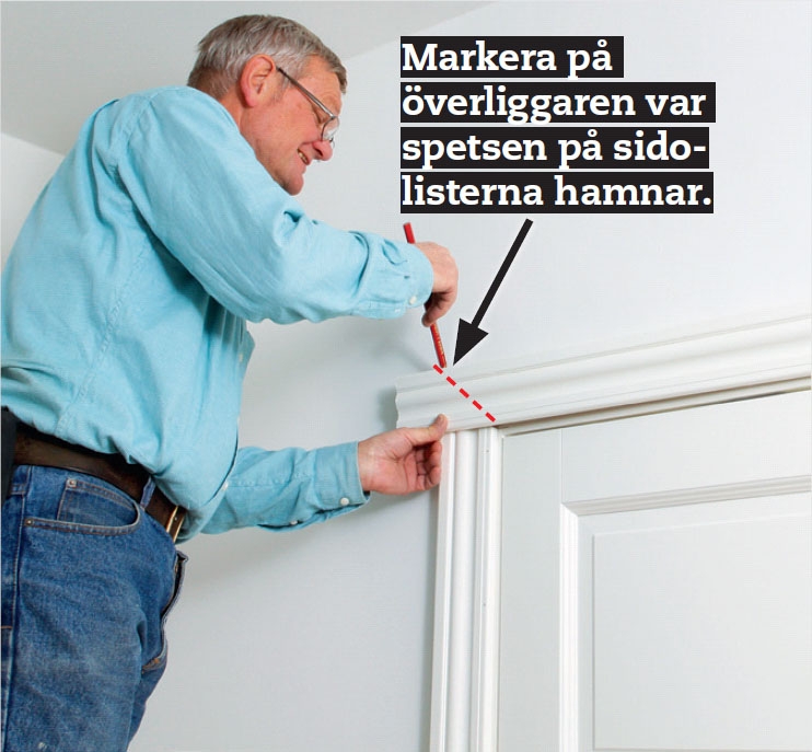 Till sist markerar du längden på överliggaren. Det enklaste är att först montera de två lodräta foderlisterna och sedan hålla överliggaren utanför medan du markerar var spetsen på listerna hamnar.