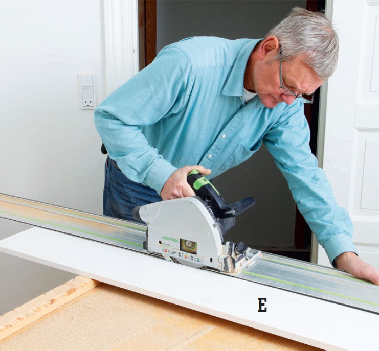 Såga till smygen (E) med cirkelsåg. Här använder vi en sänksåg, men det är inte nödvändigt. Men det är bra att använda sågskena för att styra sågen. Har du ingen spänner du fast en list på skivan.