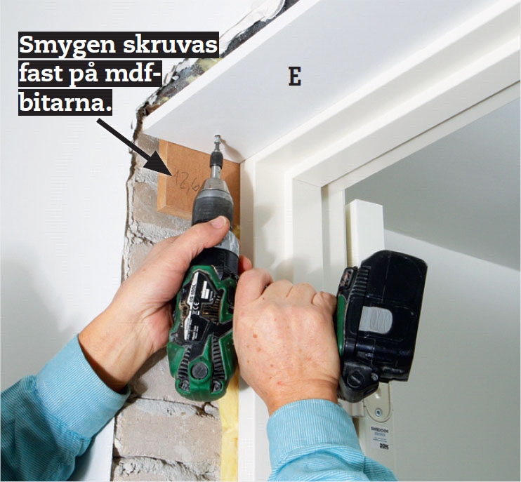Smygen (E) fäst löst liggande mellan karmens sidor. Stryk lim på den kant som vänder mot karmen och fäst sedan smygen med 4 x 30 mm skruvar i mdf-bitarna som sitter på karmen.