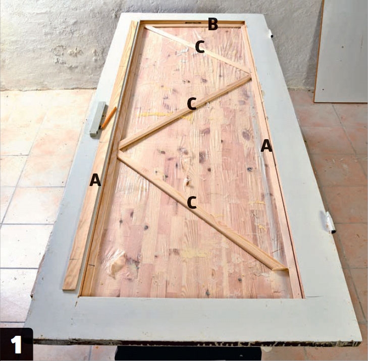 Såga till listerna. Sidolisterna (A) samt de övre och nedre listerna (B) sågas till så att de passar i dörren. Såga också till tre långa diagonala lister (C) i 45 grader och lägg dem mellan listerna (A).