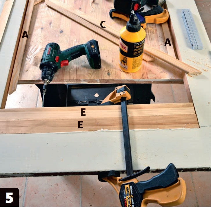 Bottenbitarna (E) monteras. Stryk lim på bitarna och skruva fast dem med kraftiga skruvar. Sätt också ett par skruvar från dörramens sidor, så att ramen förstärks. Därefter slipas ram och lister jämna.