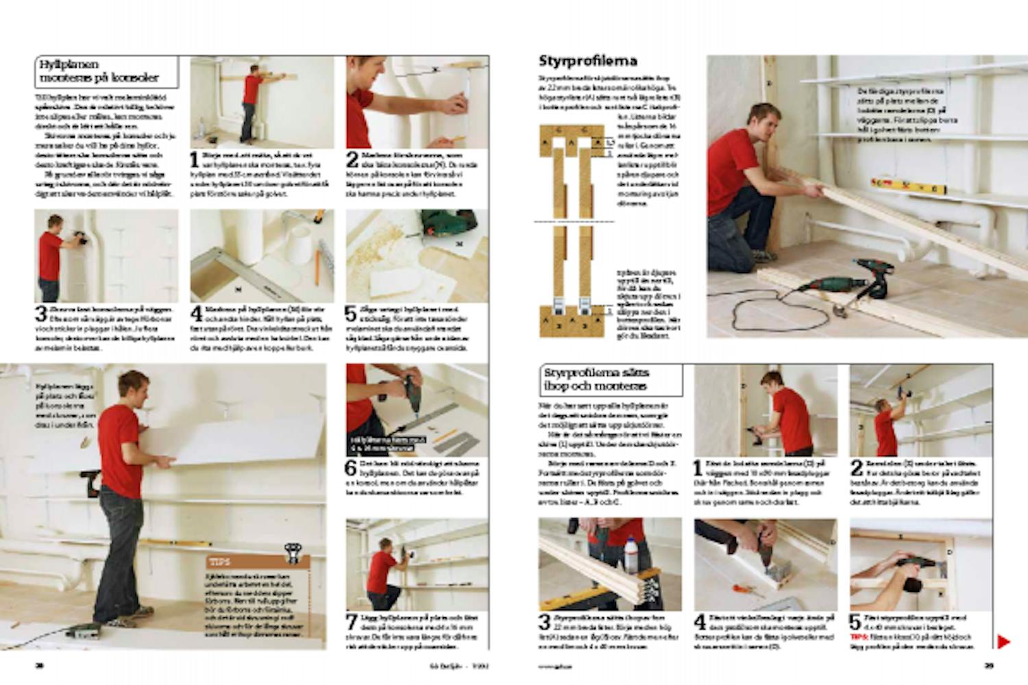 Börja med att mäta, så att du vet var hyllplanen ska monteras, t.ex. fyra hyllplan med 35 cm avstånd. Vi sätter det undre hyllplanet 50 cm över golvet för att få plats för större saker på golvet.
