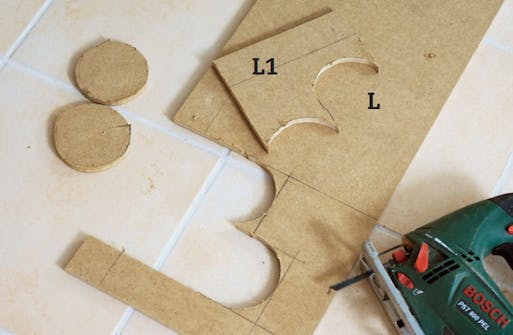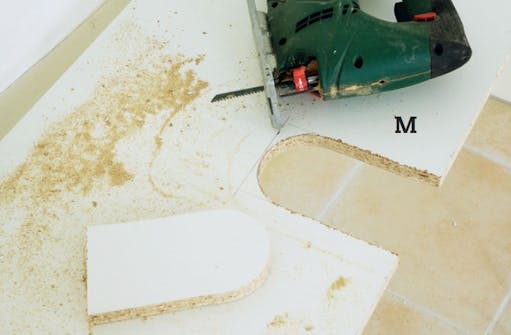 Såga urtag i hyllplanet med sticksåg. För att inte trasa sönder melaminet ska du använda fintandat sågblad. Såga gärna från undersidan av hyllplanet så får du snyggare ovansida.