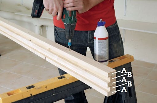 Styrprofilerna sätts ihop av fem 22 mm breda lister. Börja med en hög list (A) sedan en låg (B) osv. Fäst dem en efter en med lim och 4 x 40 mm skruvar.