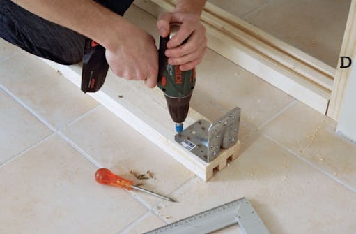 Fäst ett vinkelbeslag i varje ände på den profil som ska monteras upptill. Bottenprof len kan du fästa i golvet eller med skruvar snett in i ramen (D).