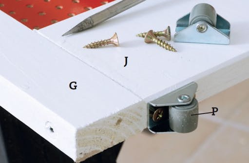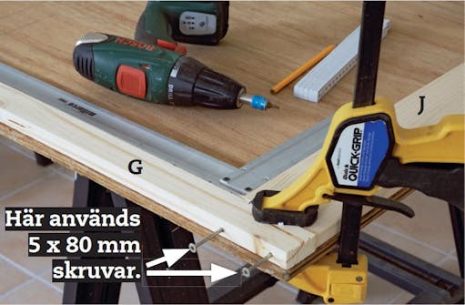 Skruva ihop ramarna med långa skruvar genom sidorna (G) och in i listerna J och H. Lägg listerna på en vinkelrät skiva så blir också ramarna vinkelräta. Fixera listerna med tving medan du skruvar.